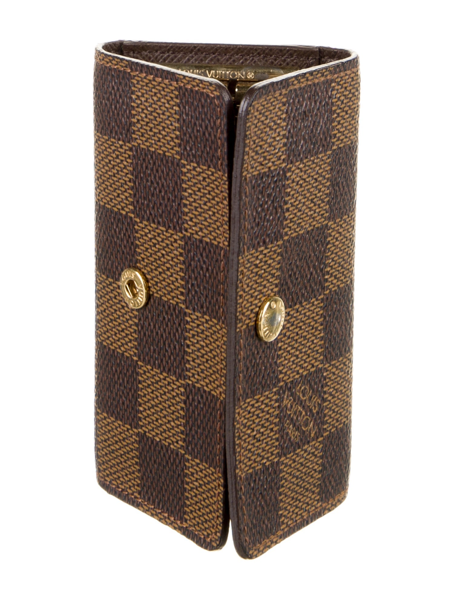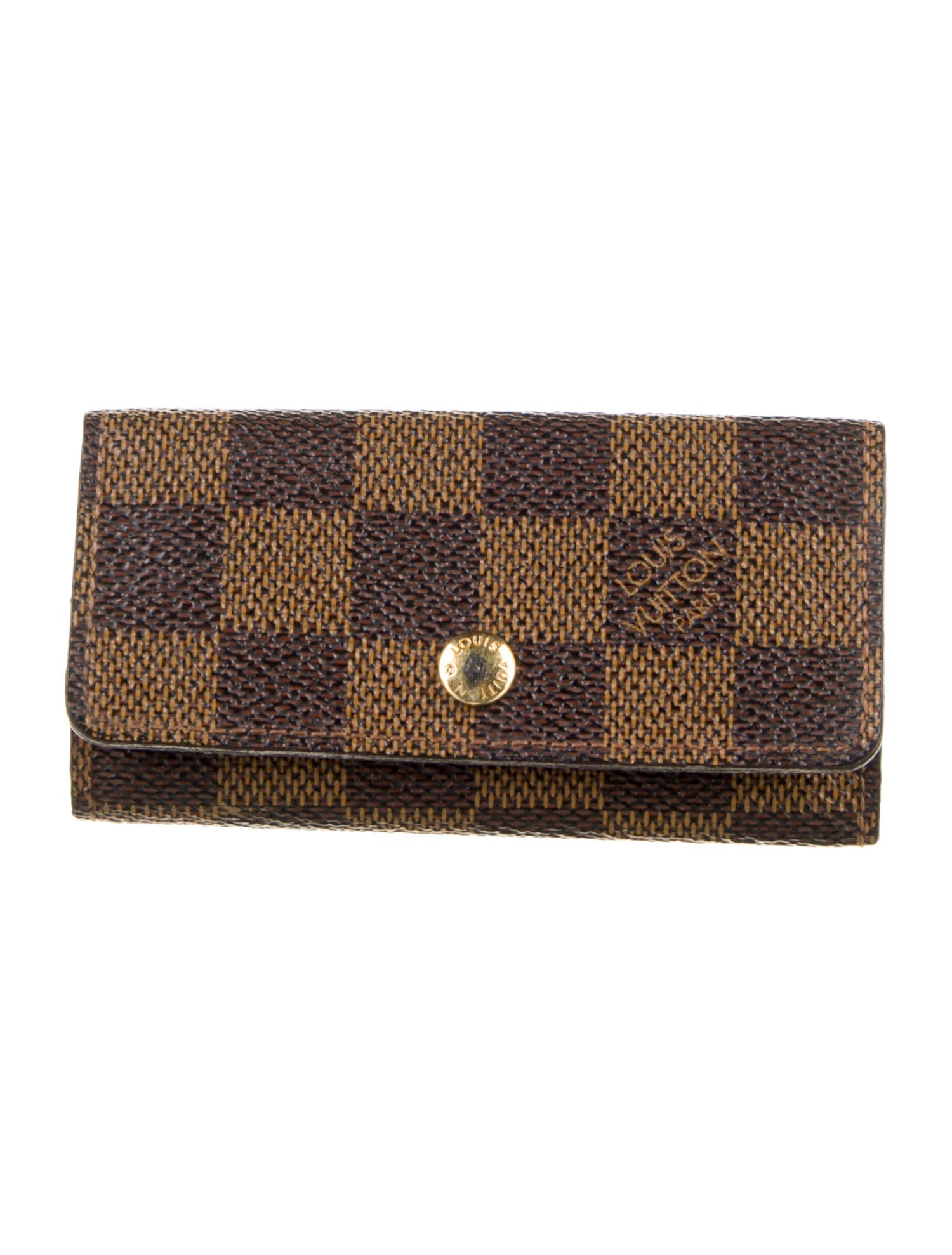 Coated canvas brown Louis Vuitton Damier Ebene Multicles 4 Key Holder with snap closure and gold tone hardware.